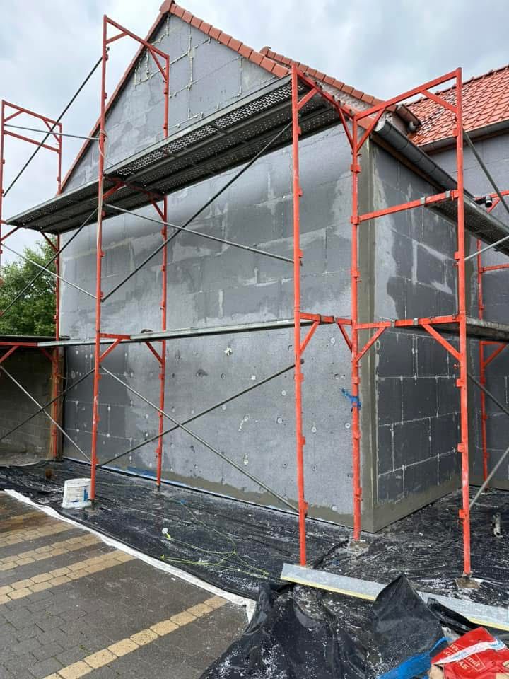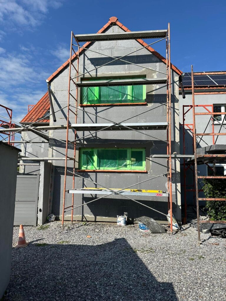 • 🔨 Le bâtiment est en travaux avancés, avec un enduit déjà appliqué sur la façade.
